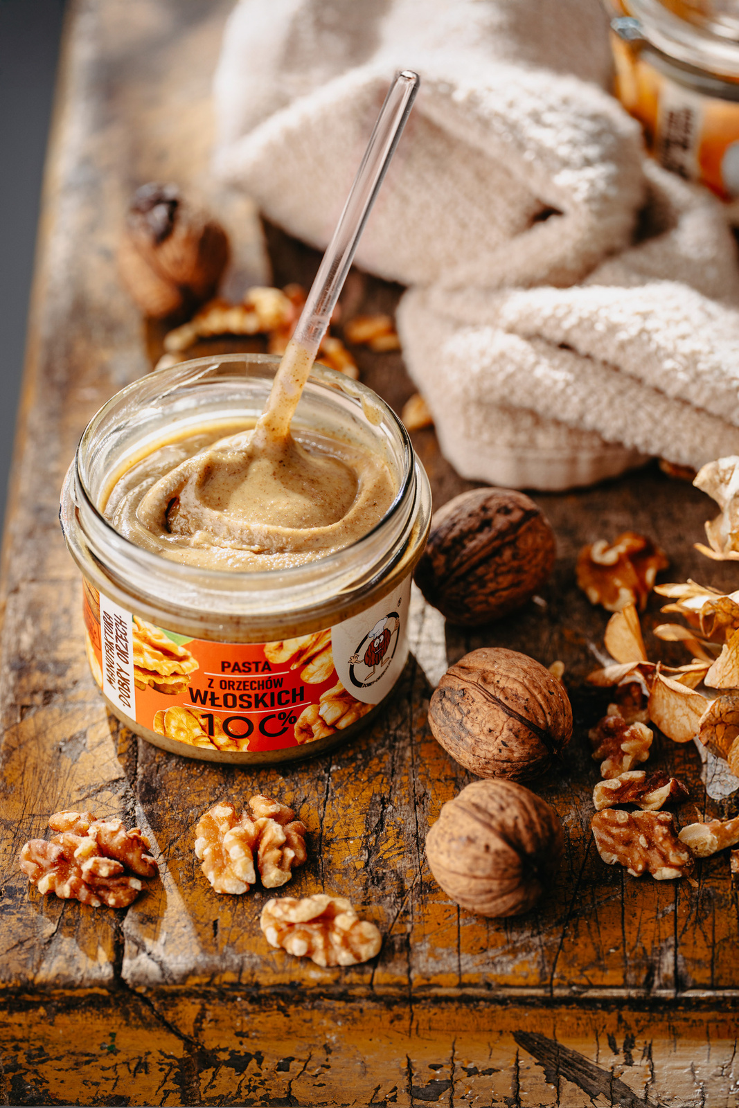 Nasza pasta z orzechów włoskich 100% została wyprodukowana tylko z jednego składnika, co oznacza, że jest wolna od konserwantów, sztucznych aromatów, stabilizatorów oraz chemicznych substancji. Nie stosujemy również tłuszczów utwardzonych, a widoczny po rozwarstwieniu olej pochodzi w pełni z użytych do wyrobu orzechów. Dbamy o to, aby każdy smakosz znalazł u nas wyroby dopasowane do swoich preferencji, które przy okazji dostarczą mu szerokiej gamy składników odżywczych. To, co nas wyróżnia to niesamowity smak i nieskazitelna jakość.