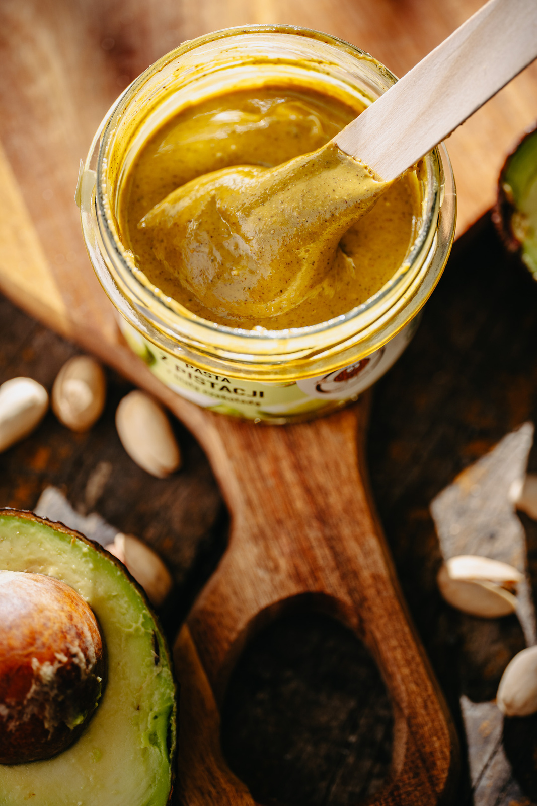 Pasta z pistacji dostępna jest w słoiczku o pojemności 180 ml.Pastę należy wymieszać przed każdym użyciem.