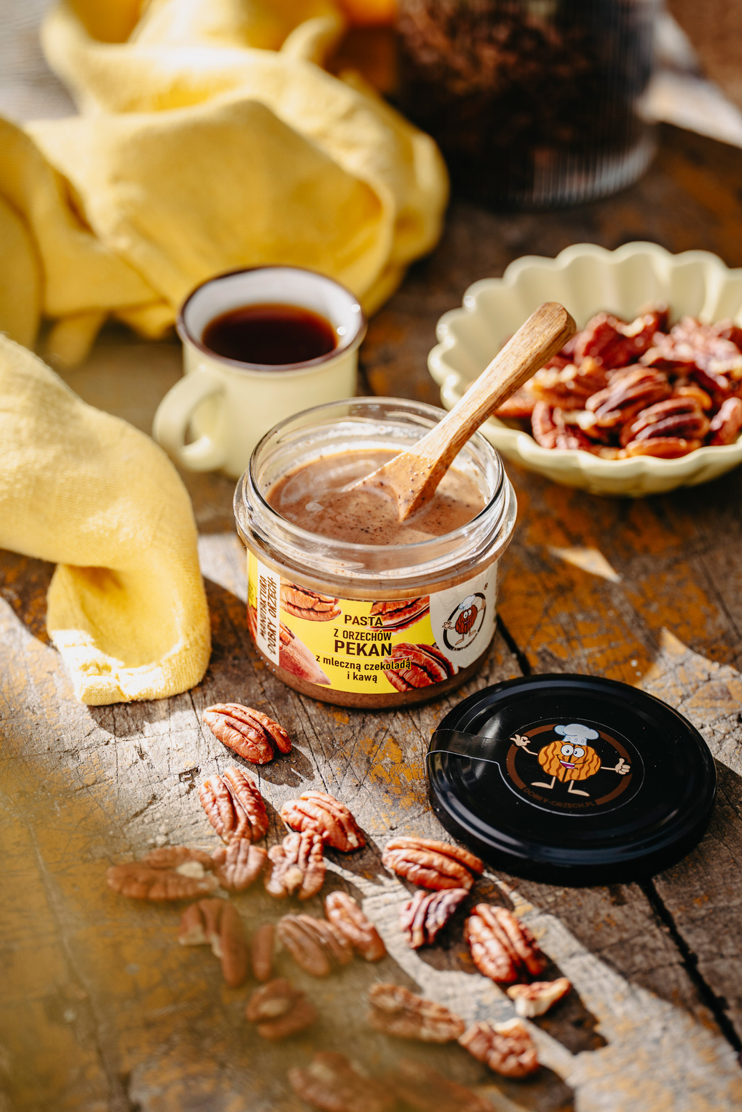 Die Pekannusspaste mit Milchschokolade und Kaffee hat einen charakteristisch zarten und zugleich kräftigen Geschmack. Für ihre Zubereitung verwenden wir wunderbaren, frisch gerösteten Kaffee aus der Rösterei El Gato in Trzebnica. Sie eignet sich hervorragend als süßer, belebender und sättigender Snack sowie als Beilage zu Frühstücken, Pfannkuchen, Obst und anderen Desserts.