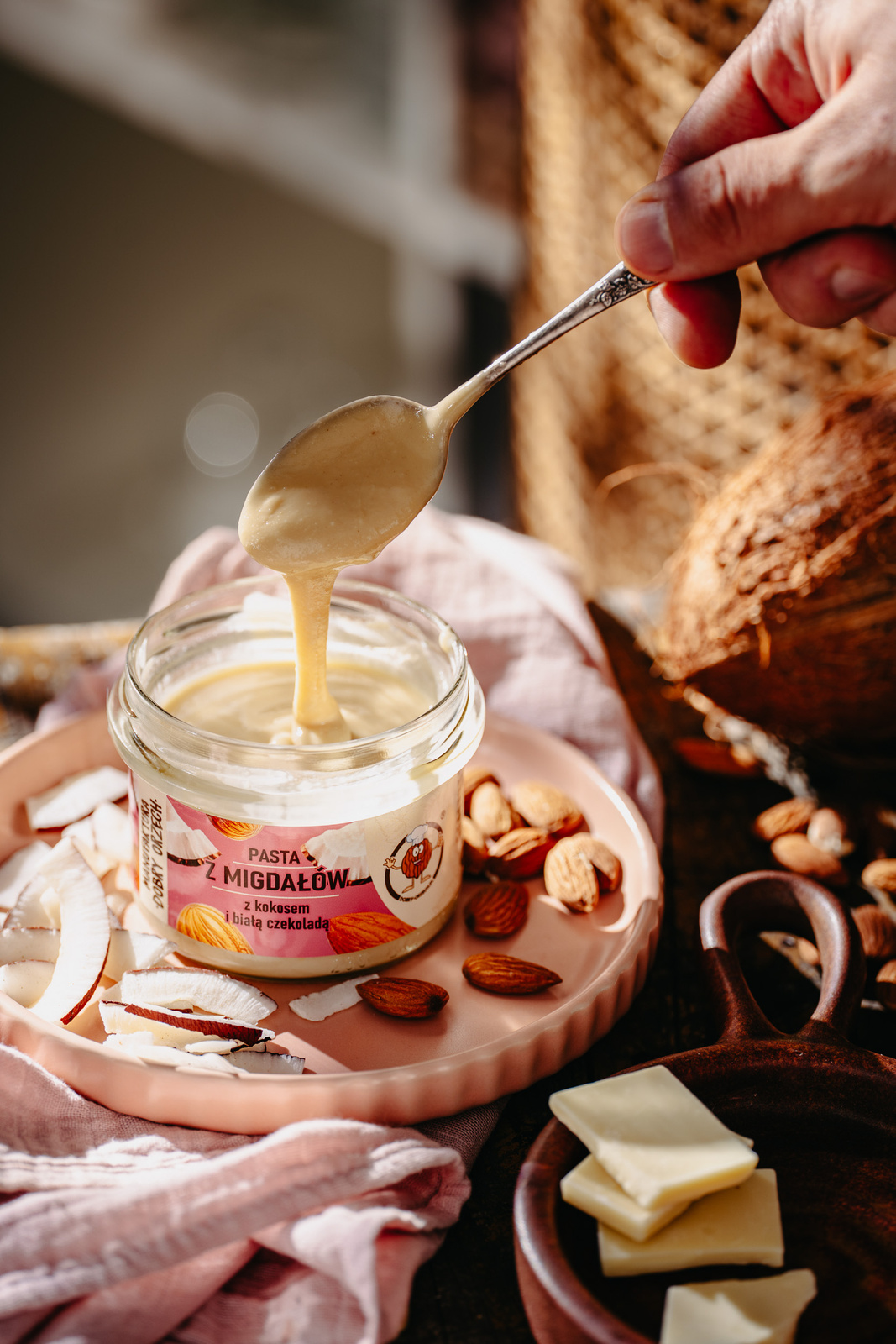 Popularne kulki kokosowe z migdałem w środku to miłość chyba każdego z nas. Mamy zatem dobrą wiadomość – nasze masełko smakuje tak samo, a nawet lepiej ;) Wszyscy kokosowi zapaleńcy poluzujcie swoje spodnie, chwyćcie łyżeczki w dłoń i do dzieła! Szybko od słoika nie odejdziecie.