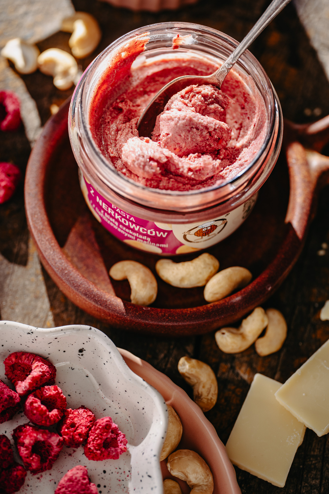 Pasta z orzechów nerkowca z białą czekoladą i malinami