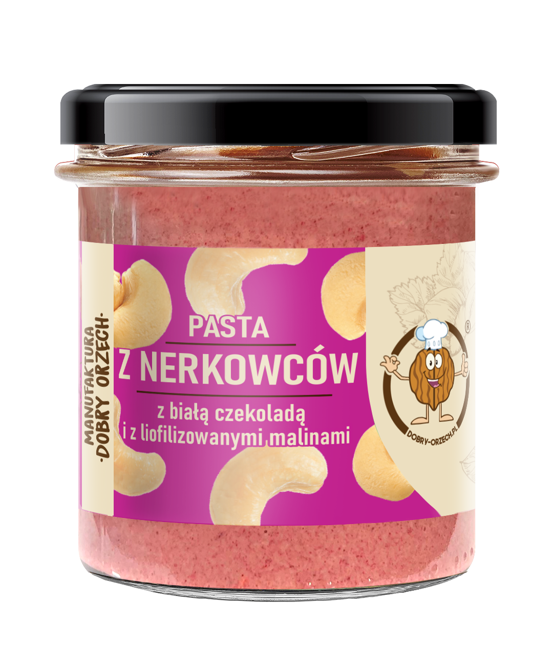 Pasta z nerkowców z białą czekoladą i malinami dostępna jest w słoiczkach o pojemności 180 ml i 270 ml.